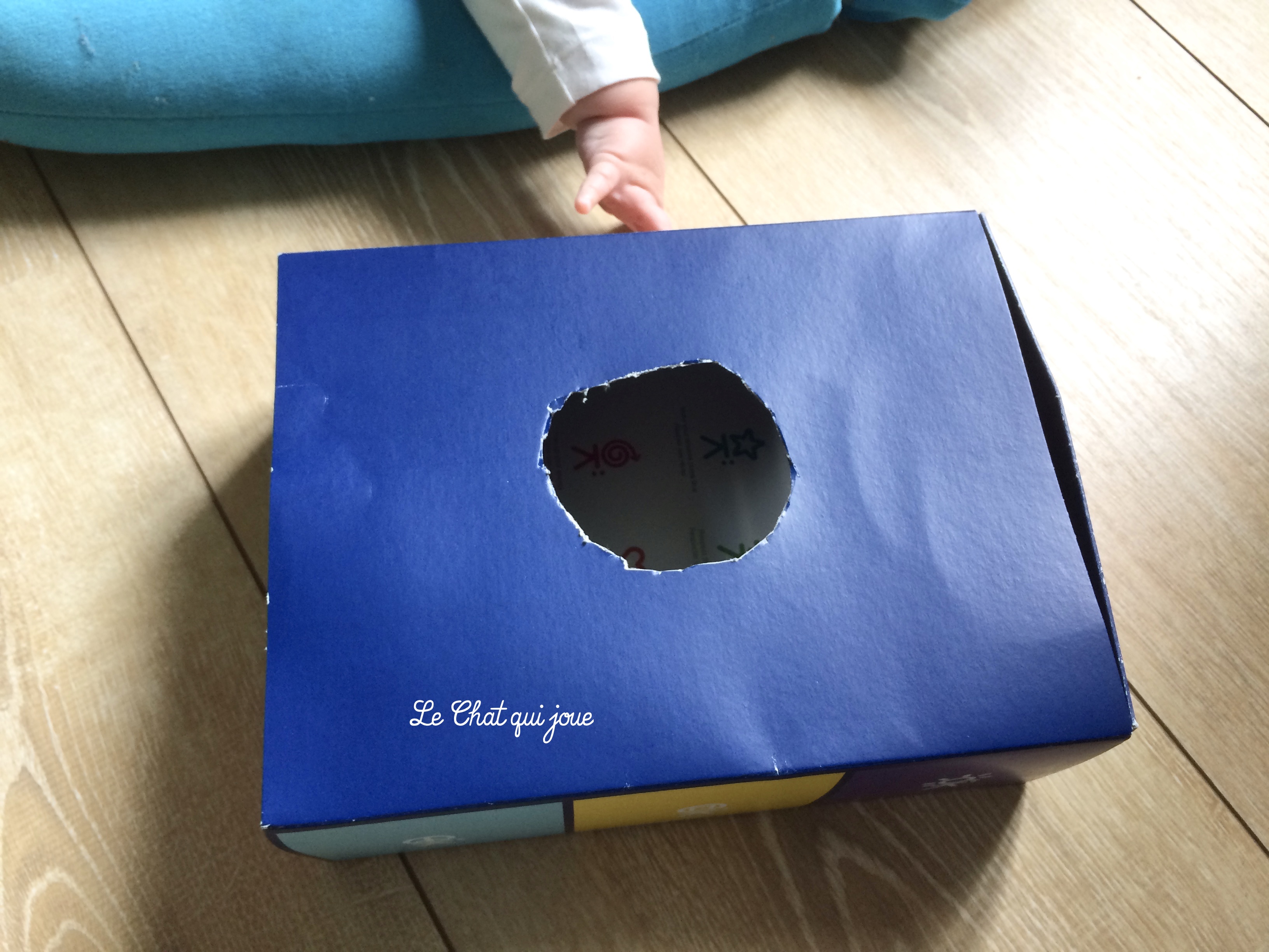 Voici donc une bien belle boîte (non, je plaisante), c’est une simple boîte cadeau pour bébé dans laquelle j’ai fait un trou et qui à défaut d’être très jolie, a le mérite de ne pas coûter 30€. Car oui, en cherchant une boîte de permanence, j’ai découvert que ce n’était pas donné. Certes, elles sont bien plus résistantes aux assauts répétées des coups de mains et de têtes parfois mais avec ma boîte en carton au moins, je n’ai pas peur que le P’tit Chat s’estramasse le front contre un coin de la boîte. Ensuite, cette petite boîte est facilement manipulable car ultra-légère (ce qui pose problème pour d’autres activités par ailleurs) et elle fera l’affaire le temps de voir si ça vaut le coup d’investir dans du solide et durable.