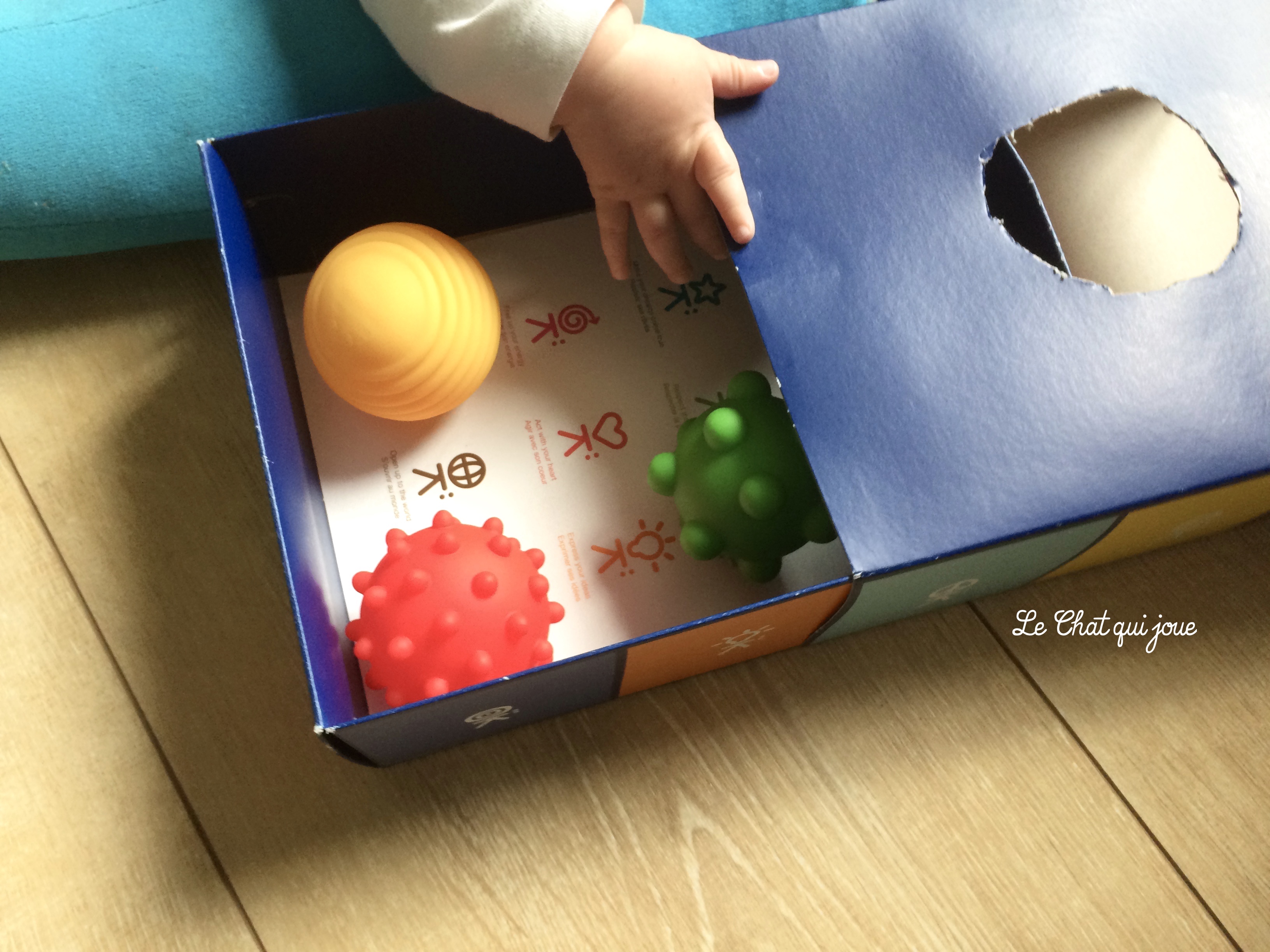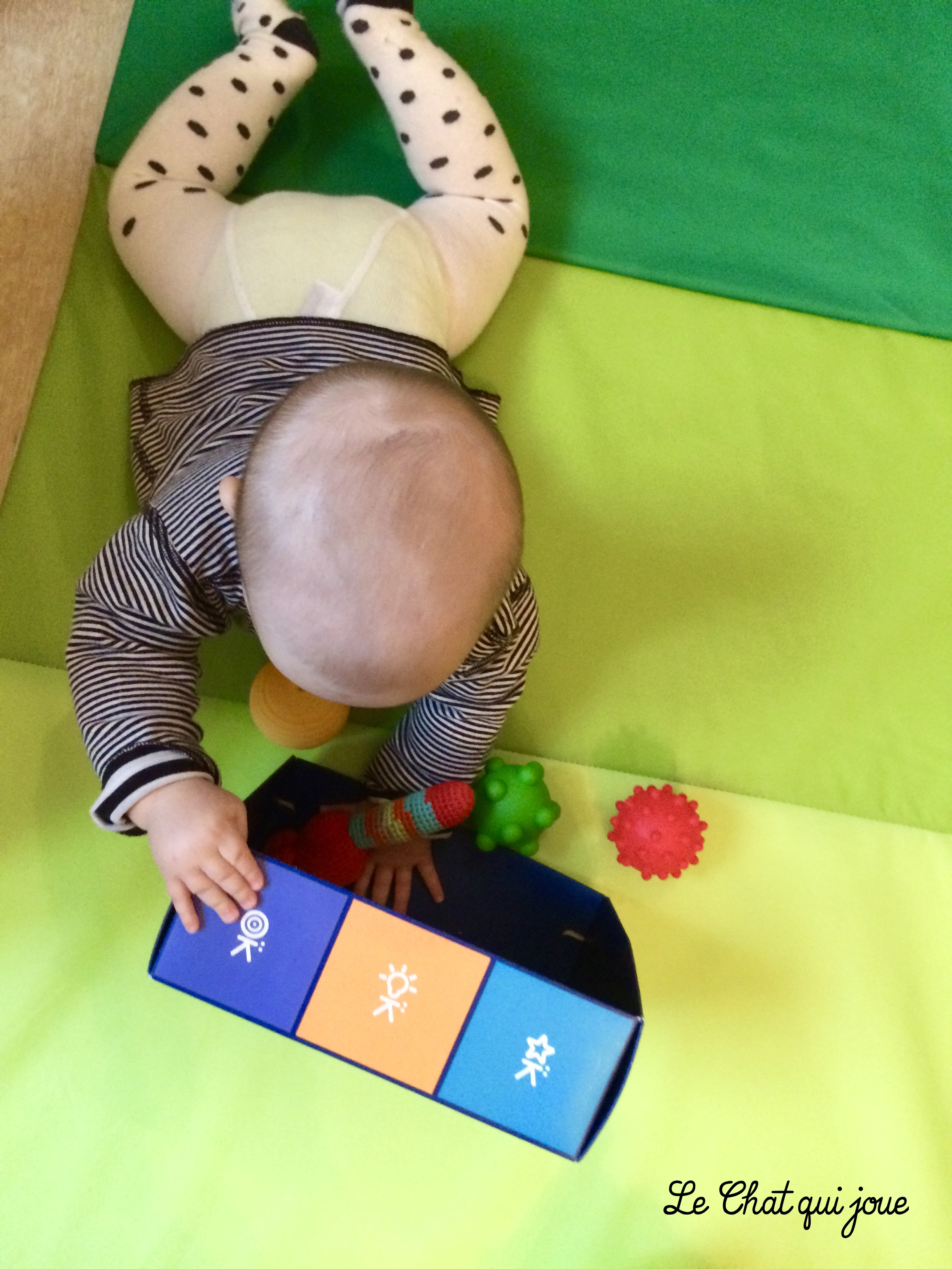 Le P’tit Chat a 6 mois et ne s’assoie pas encore seul donc il expérimente cette boîte à plat ventre. Depuis quelques jours, il se régale de sortir les objets de la boîte soit un par un, soit en secouant la boîte comme un prunier. Et devinez quoi, il s’est rendu compte que la seconde méthode était vachement plus efficace.
