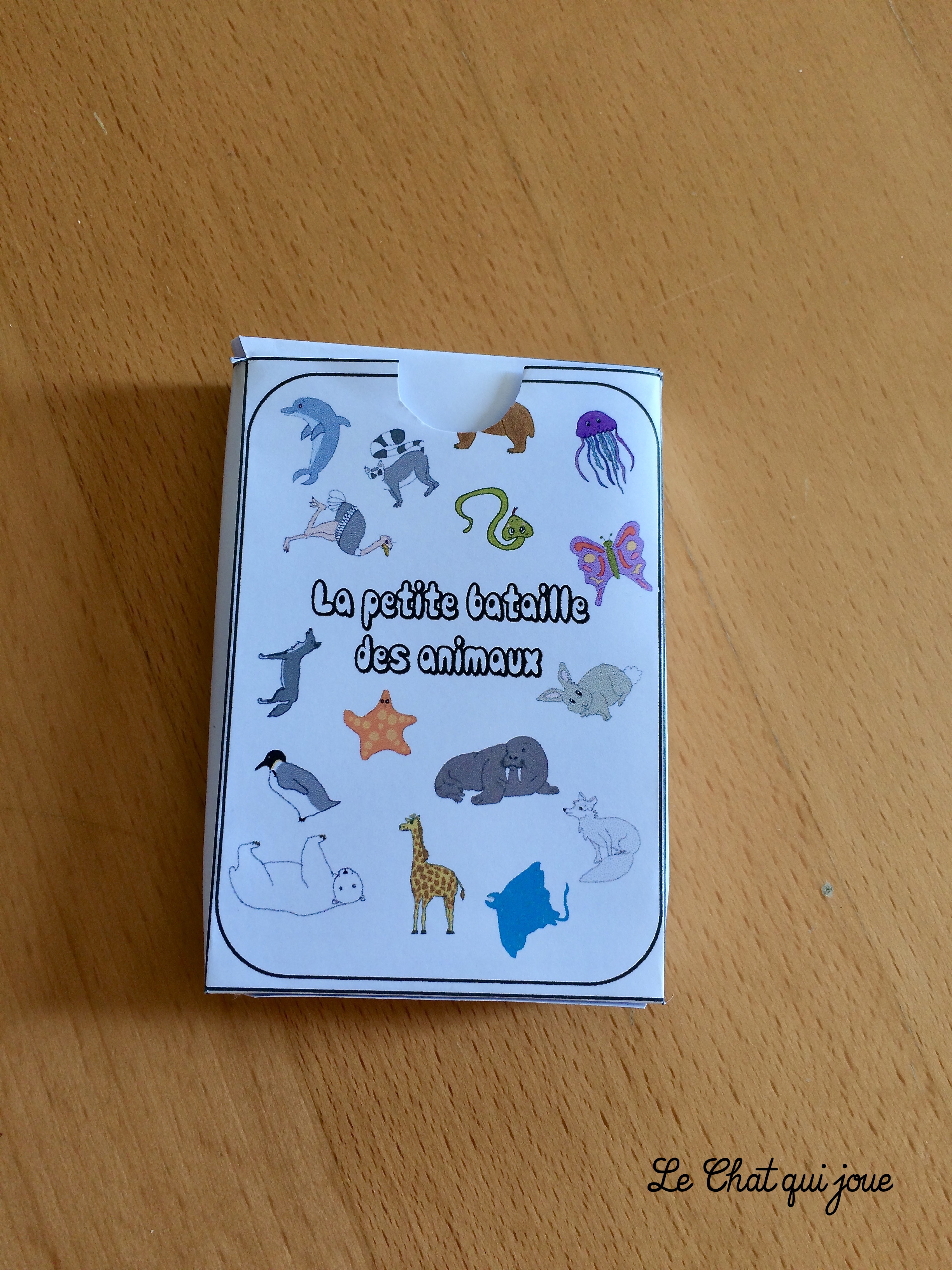 C’est un jeu de cartes similaire à l’incontournable batawaouf de djeco. La règle du jeu est simple, la carte où figure l’animal le plus grand (4 tailles différentes) remporte la manche, en cas d’égalité, on rejoue par dessus jusqu’à ce qu’il y ait une différence. Le gagnant remporte alors toutes les cartes. Le jeu s’arrête une fois qu’un de deux joueurs se retrouve sans carte.