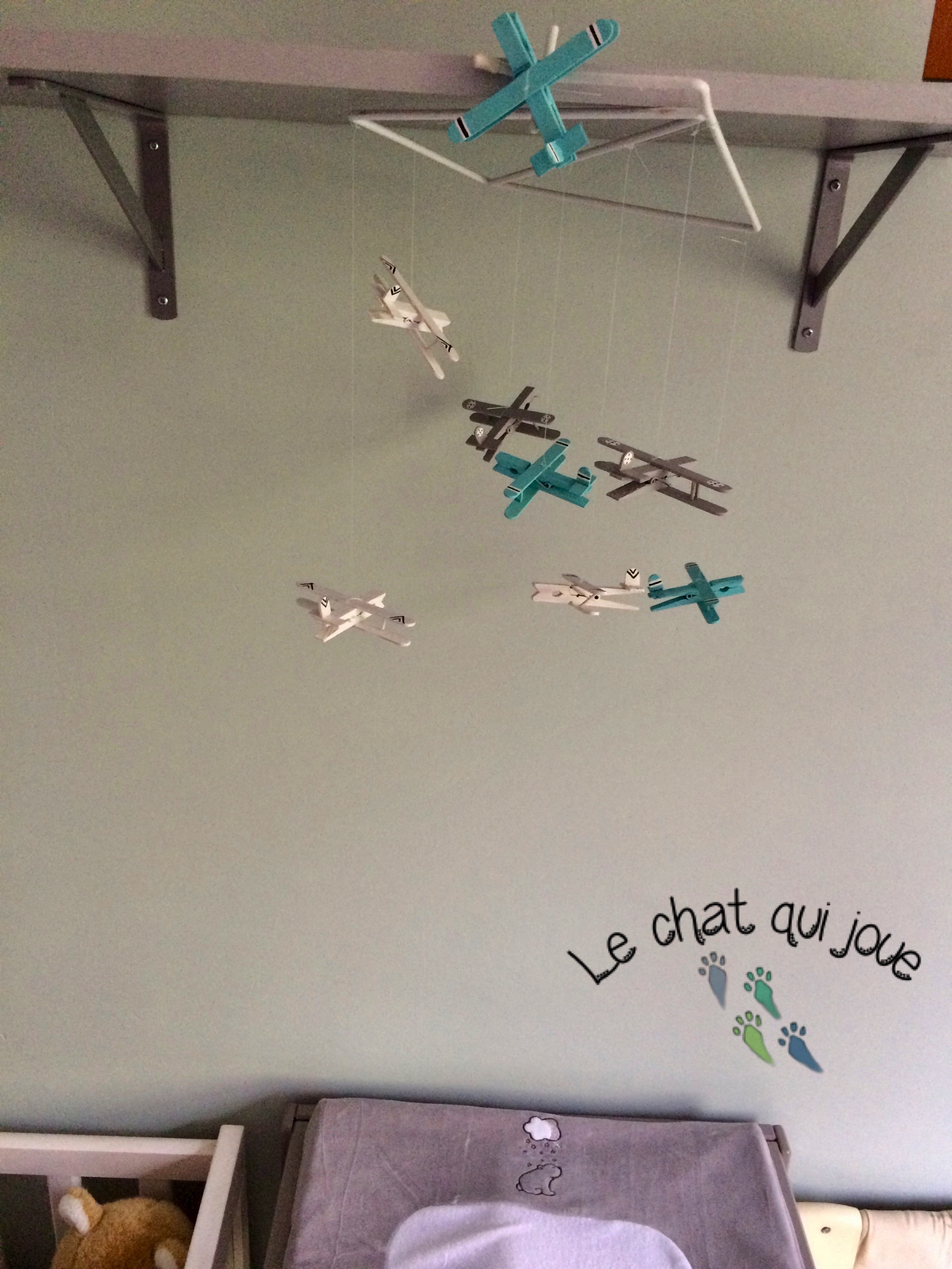 Pendant ma grossesse, j’ai cherché des mobiles, et j’ai été forcée de constater qu’ils n’étaient soit pas à mon goût soit hors de mon budget. J’ai donc farfouillé sur le net et j’ai trouvé des DIY d’un avion pince à linge pour jouer (en voici un avec un schéma simple) et je me suis dit que ça ferait un mobile sympa pour ce futur petit bébé.